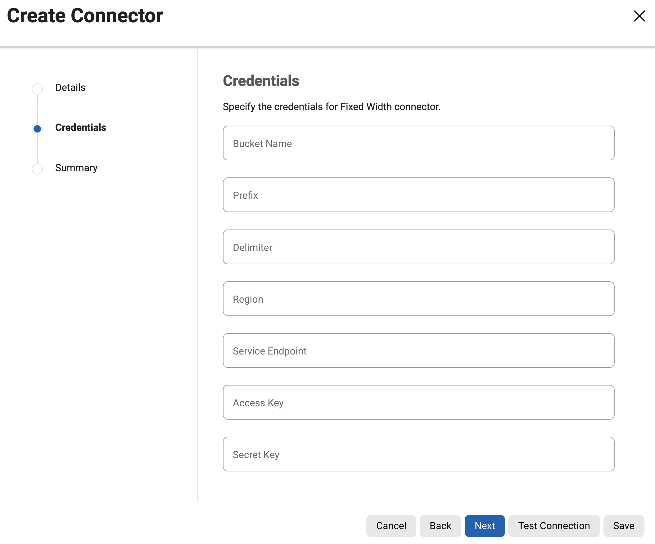 { "connectorName":"S3 Compatible storage", "environmentId":37, "fileType":"JSON", "connectionInfo":{ "connectionMode":"S3_COMPATIBLE", "s3CompatibleDetails" : { "prefix":"json/", "delimiter":"/", "region":"us-west-2", "bucketName":"s3-compatible-bucket-name", "accessKey":"<Your Access Key>", "secretKey":"<Your Secret Key>" } } }