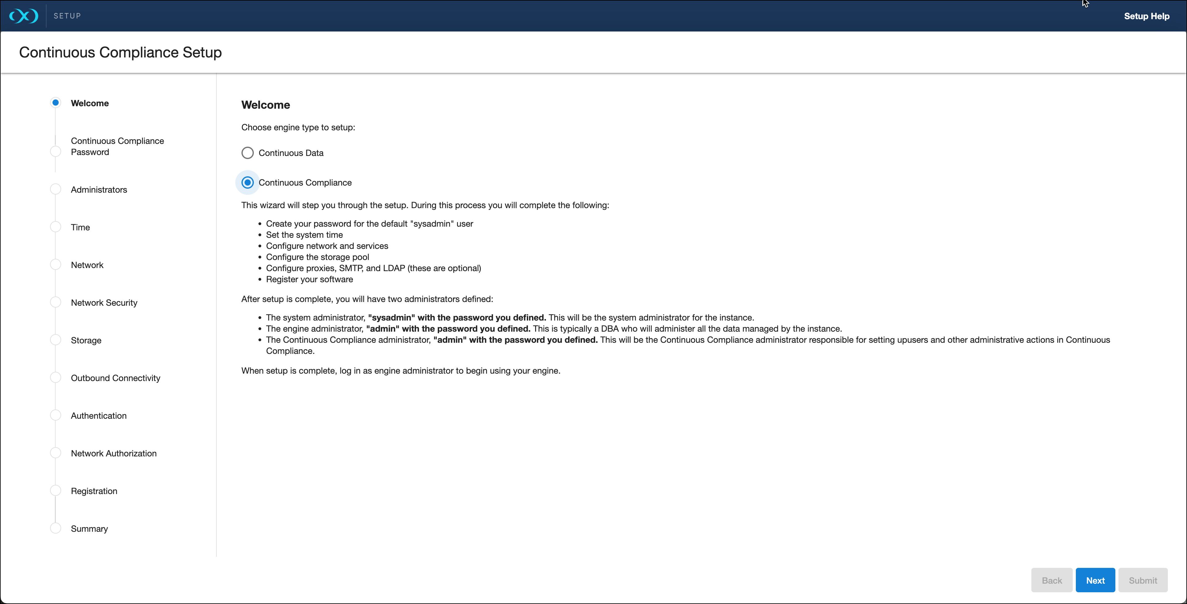 Once you setup the network access for your Delphix Engine, enter the Delphix Engine URL in your browser for server setup. The Unified Setup wizard Welcome screen below will appear for you to begin your Delphix Engine setup.