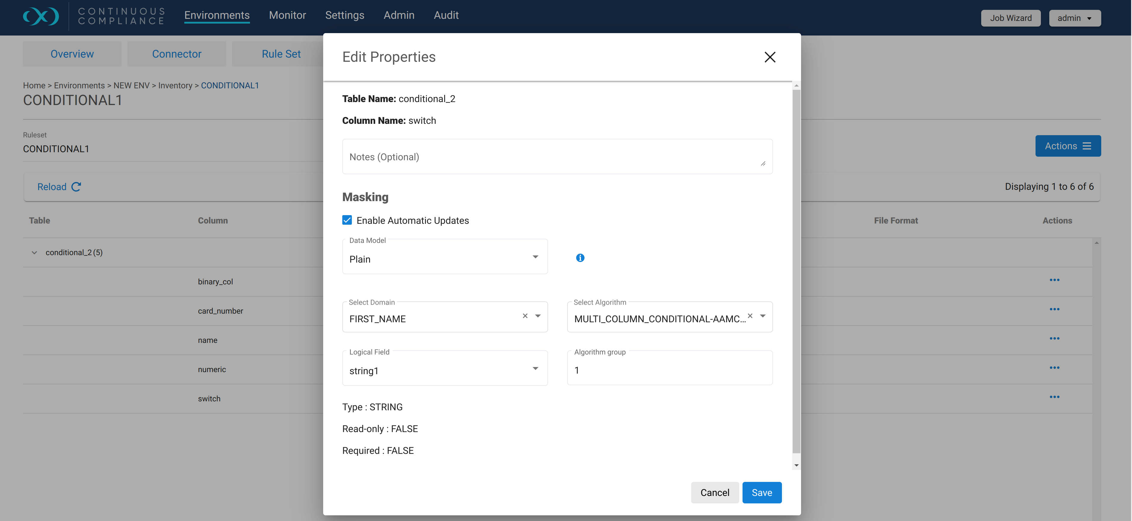 column. The JSON used to configure the algorithm supports a list of various possible values found in the key column, or conditions. Each condition determines how the other columns referenced by the algorithm are masked.