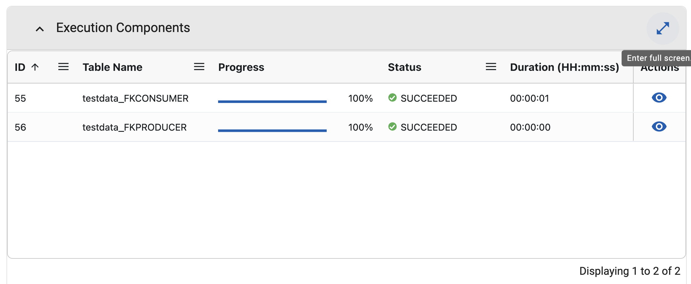 In addition to seeing this information about each job, you can look into the status/progress of each table/file defined in the job. Each table/file will be displayed under Execution Components. It includes information such as Time taken for processing, Rows Masked per Minute, Rows Masked, Rows Remaining, Number of columns/fields having Non-conformant data, etc.