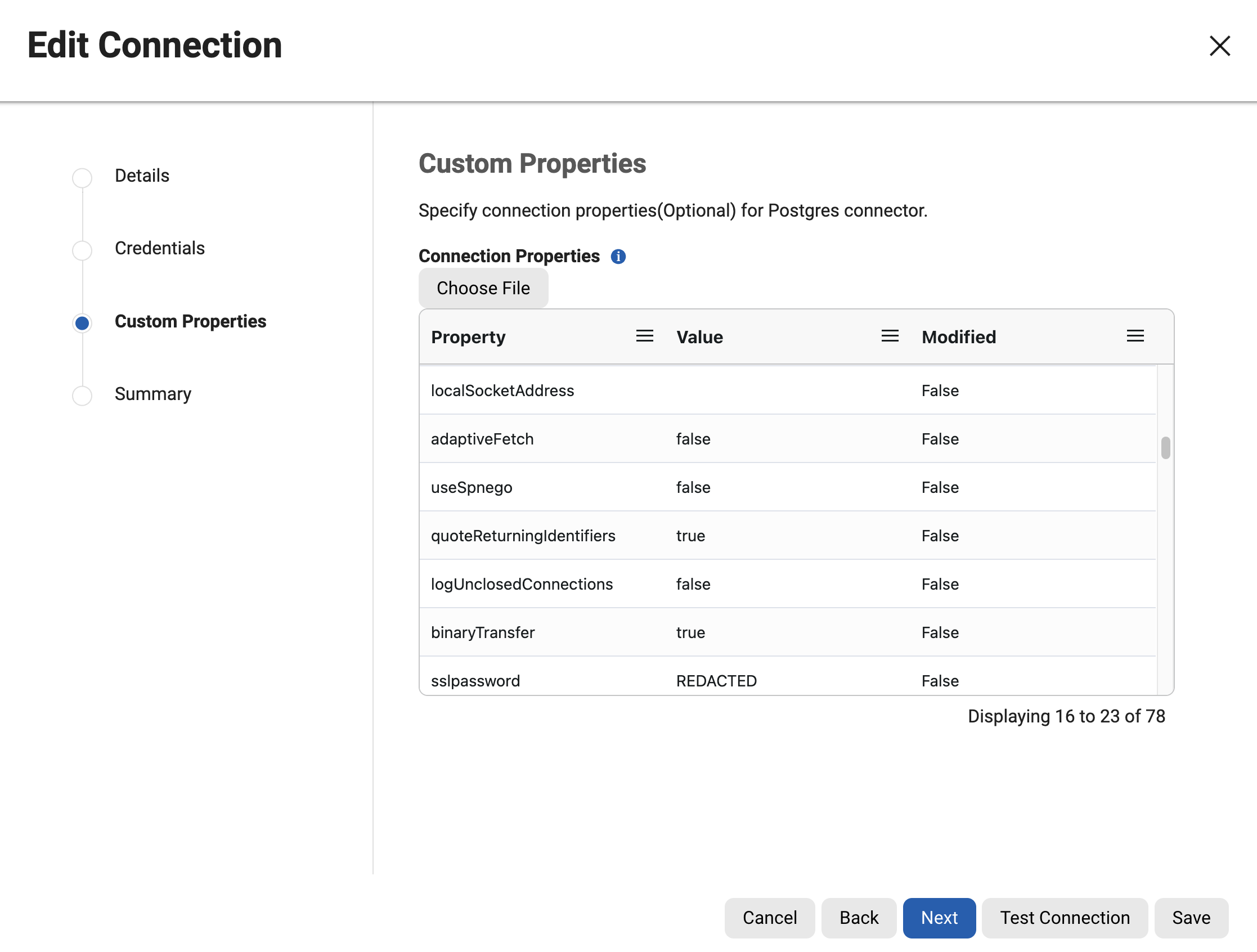 To retrieve all properties set on the connector, make a request to the GET database-connector/{id}/properties endpoint. This endpoint will respond with all default properties set by the driver, superimposed by any properties specified by an uploaded connection properties file. If a properties file is uploaded for a connector, this list can also be viewed through the UI on the database connector form, where you can sort by Property, Value, or Modified. The Modified field signifies whether the property value is the default or modified by the uploaded properties file.
