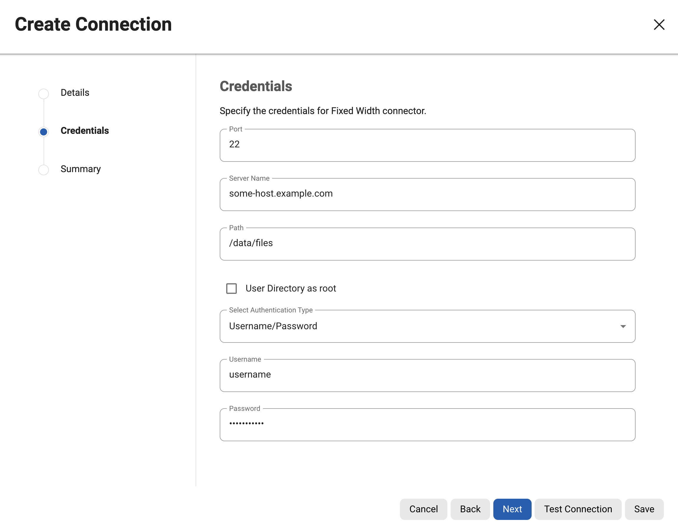 For SFTP,FTP & FTPS connection modes, the following values appear under the credential step: