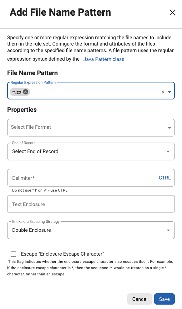 Delimited:File Name or Pattern, Format File, End of Record, Delimiter, Text Enclosure, Enclosure Escape Strategy, Escape Enclosure Escape Character, Is Pattern.