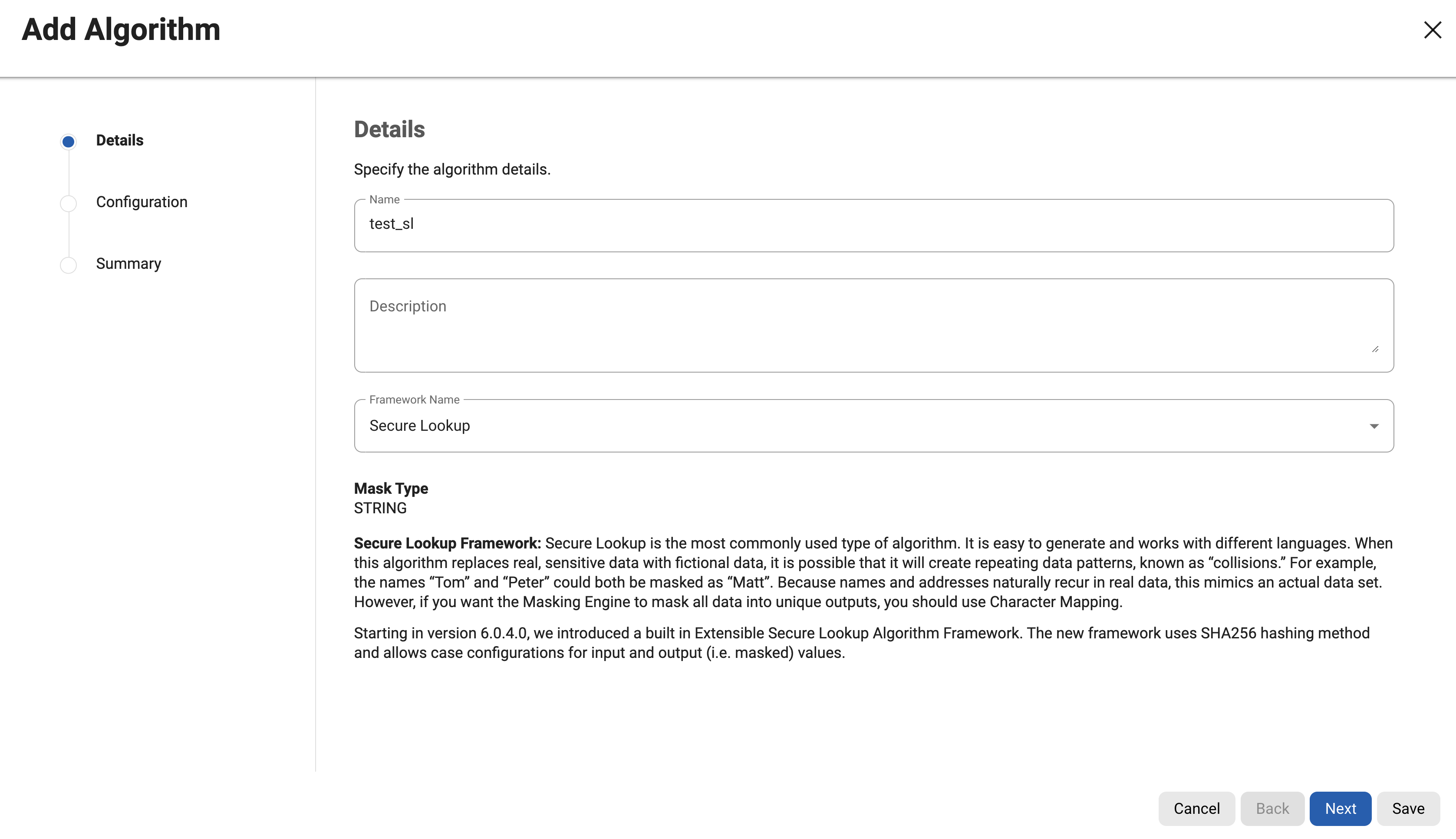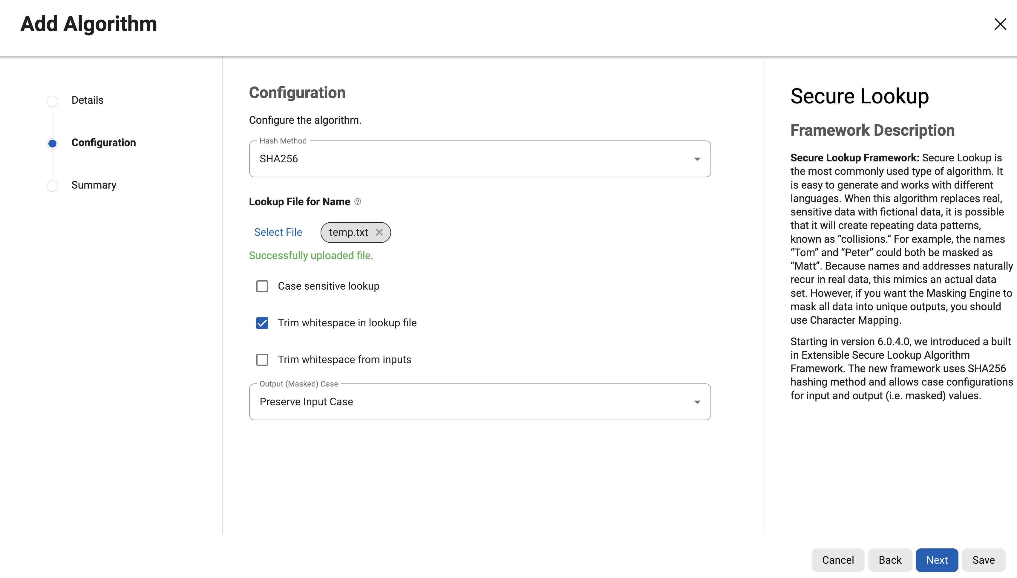 Starting in version 6.0.4.0, we introduced a built in Extensible Secure Lookup Algorithm Framework. The new framework uses SHA256 hashing method and allows case configurations for input and output (i.e. masked) values.