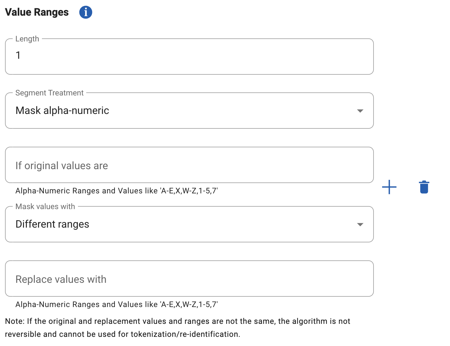 For Mask alpha-numeric, you can specify an original value range and a mask value range. If either of these fields is left blank, it will use the default value range, which is 0-9,A-Z. Use the value range fields to specify individual values and ranges, for example 'A-F,P,R,1-5,7,9'.