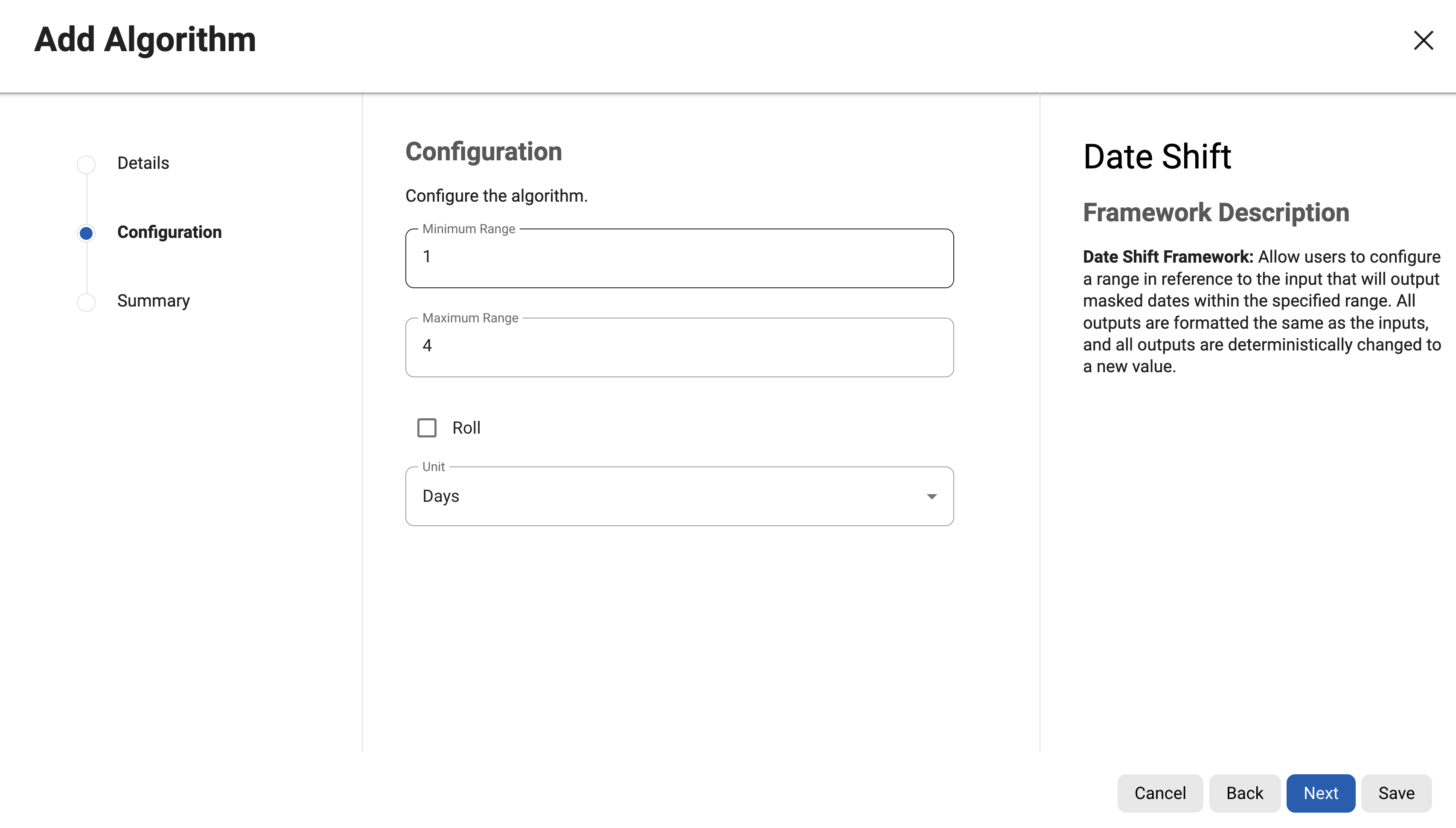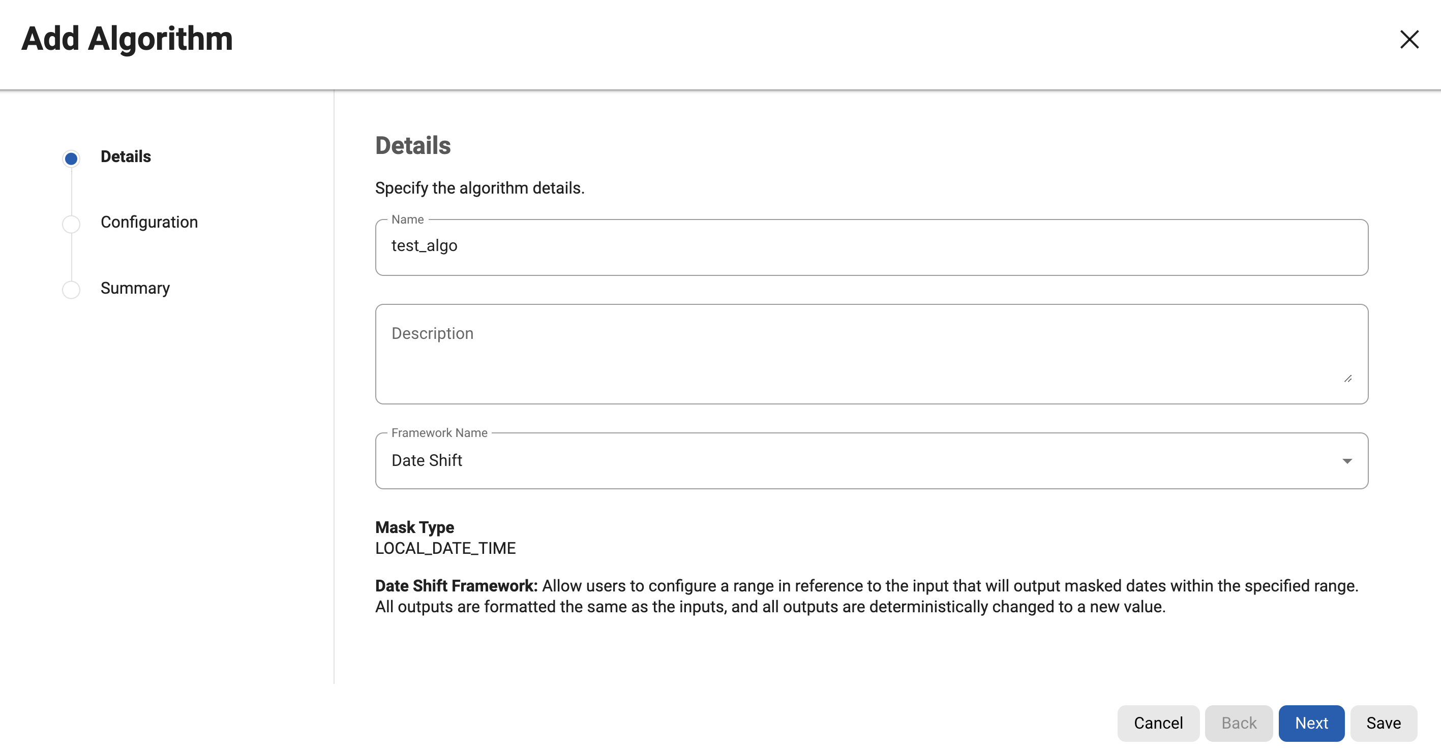 Enter the configuration according to the Algorithm framework, and click next.