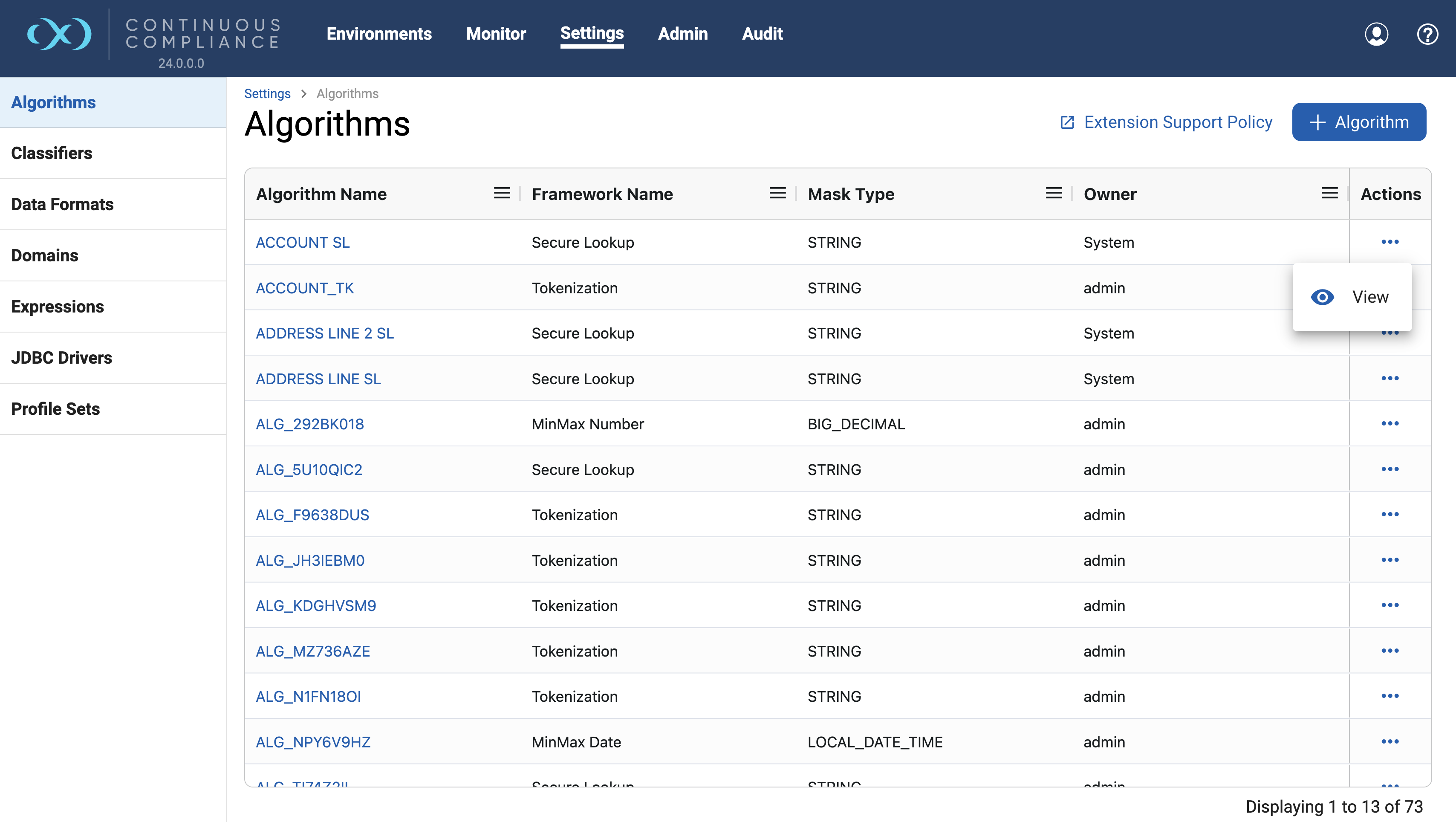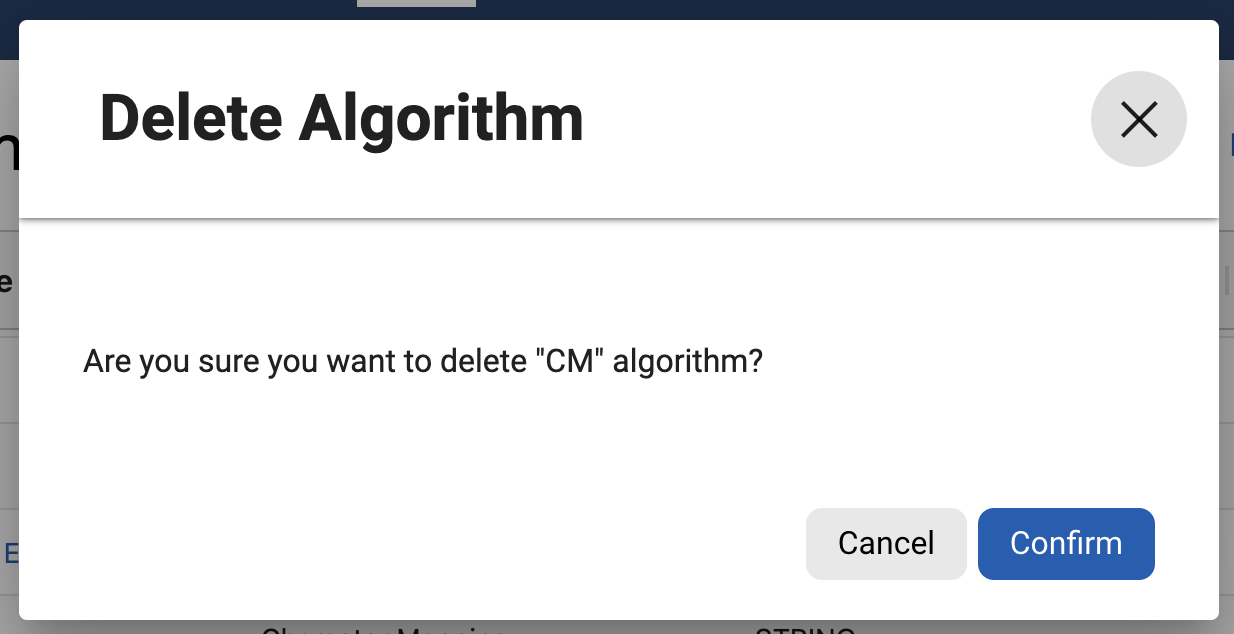 Click the (…) button to the right of the corresponding row under the Actions column and select the Delete option to delete an algorithm.