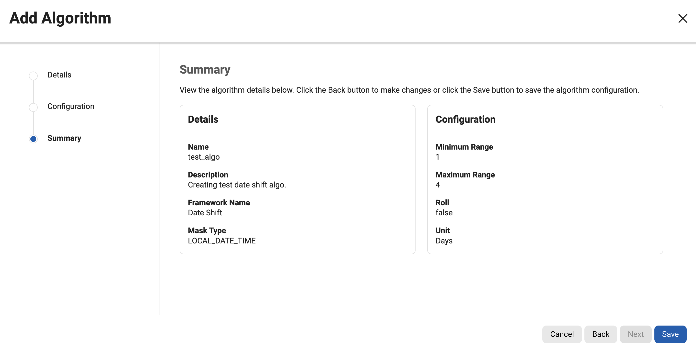 Algorithm name and framework type cannot be changed after creation. Users can edit the configuration on the second step of the wizard and click save to modify changes.