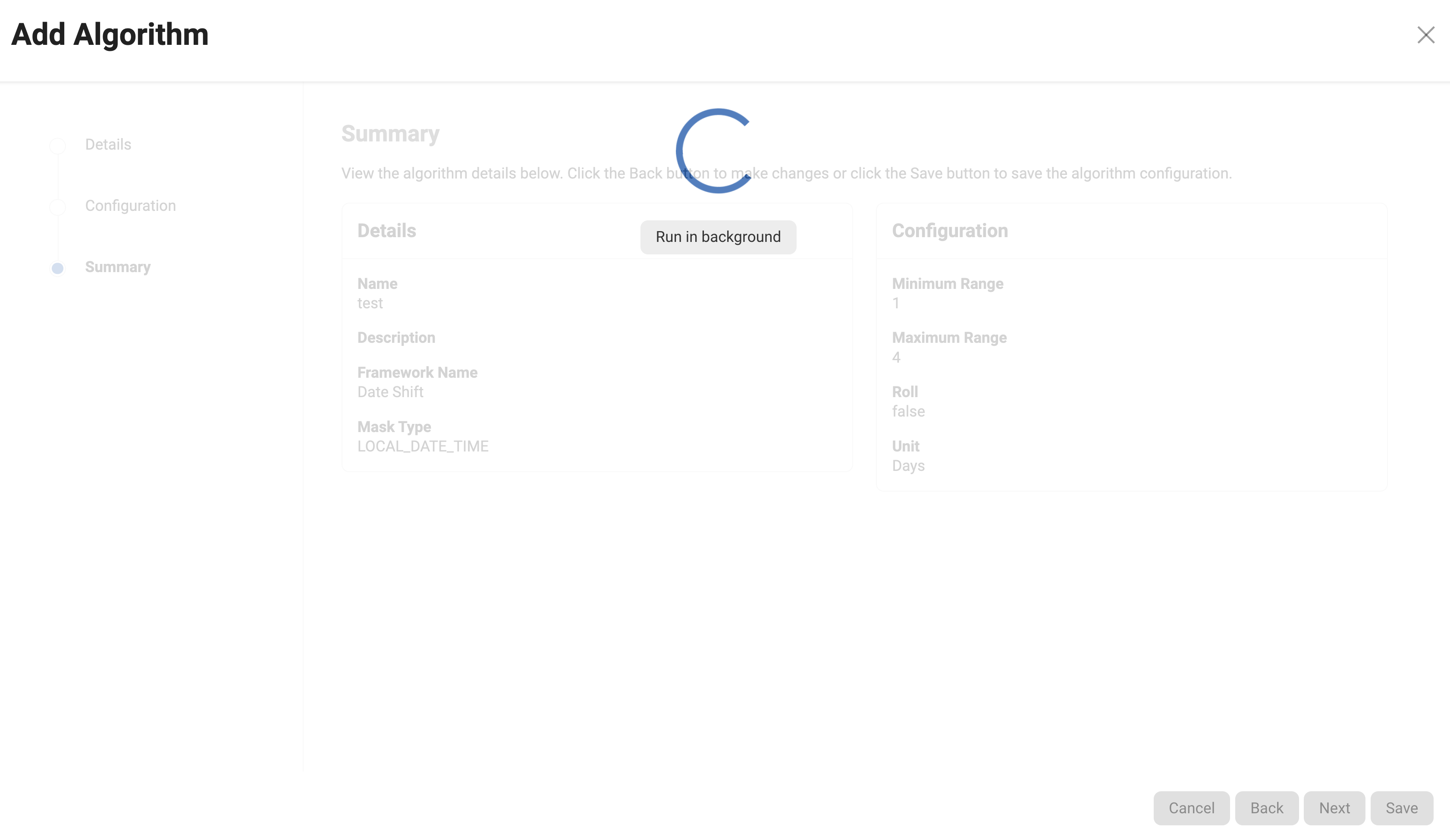 Algorithm creation and editing are types of Async Tasks. In some cases, it might take some time to create an Asycn task for creating or editing an algorithm. In that case, the User can select the Run in background option when it appears on the wizard which will close the wizard run the task in the background, and continue with other work.