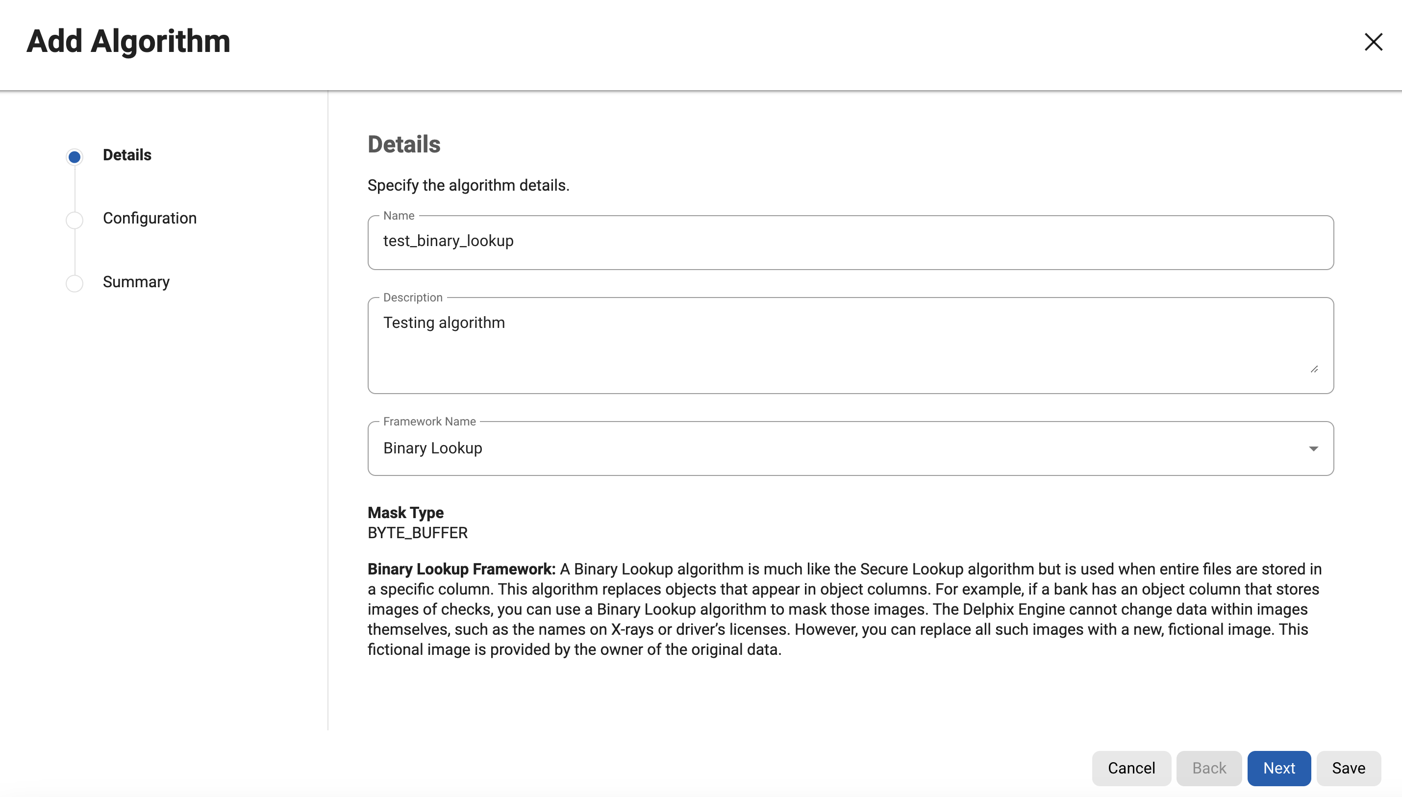 A Binary Lookup algorithm is much like the Secure Lookup algorithm but is used when entire files are stored in a specific column. This algorithm replaces objects that appear in object columns. For example, if a bank has an object column that stores images of checks, you can use a Binary Lookup algorithm to mask those images. The Delphix Engine cannot change data within images themselves, such as the names on X-rays or driver’s licenses. However, you can replace all such images with a new, fictional image. This fictional image is provided by the owner of the original data.