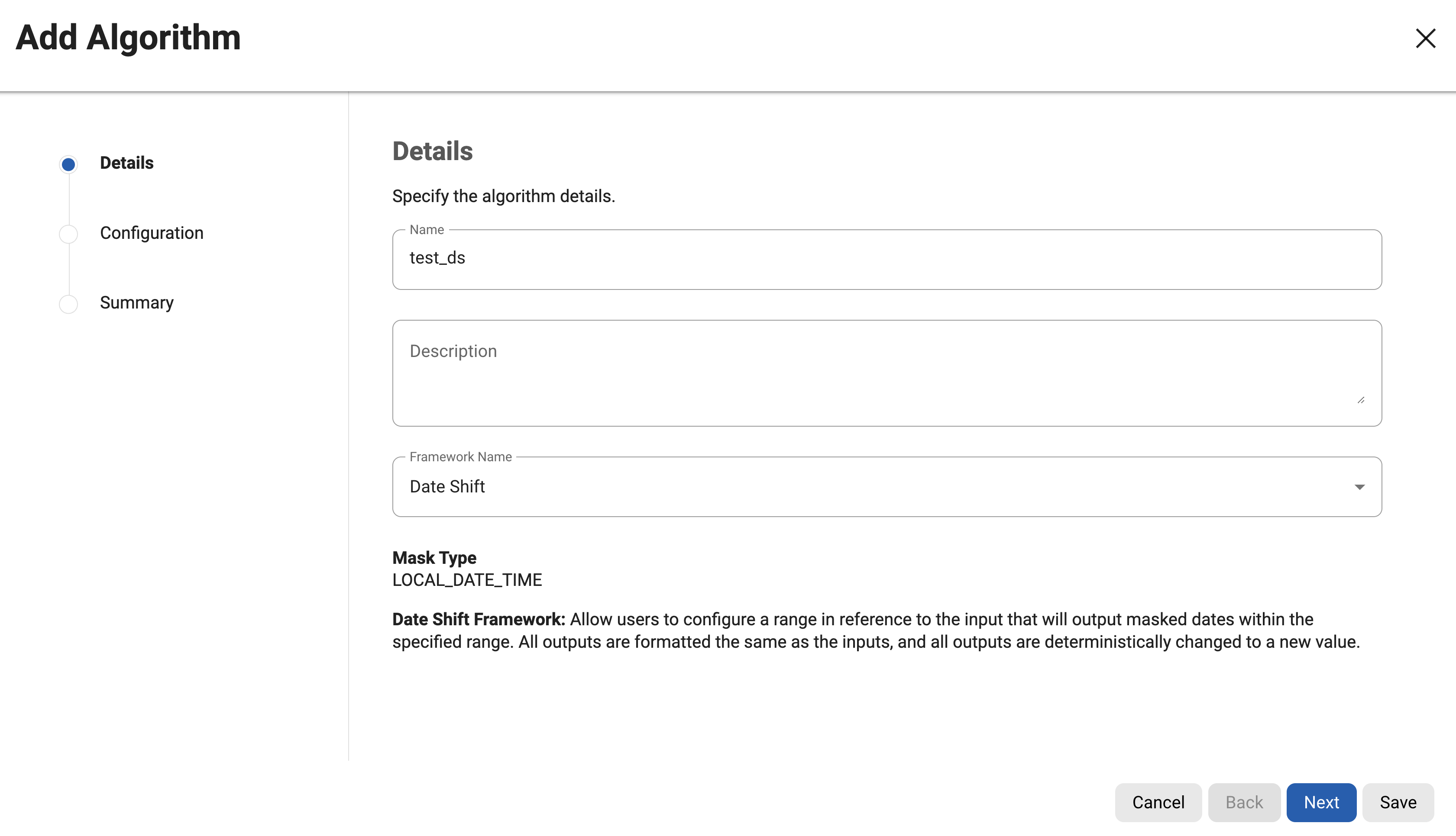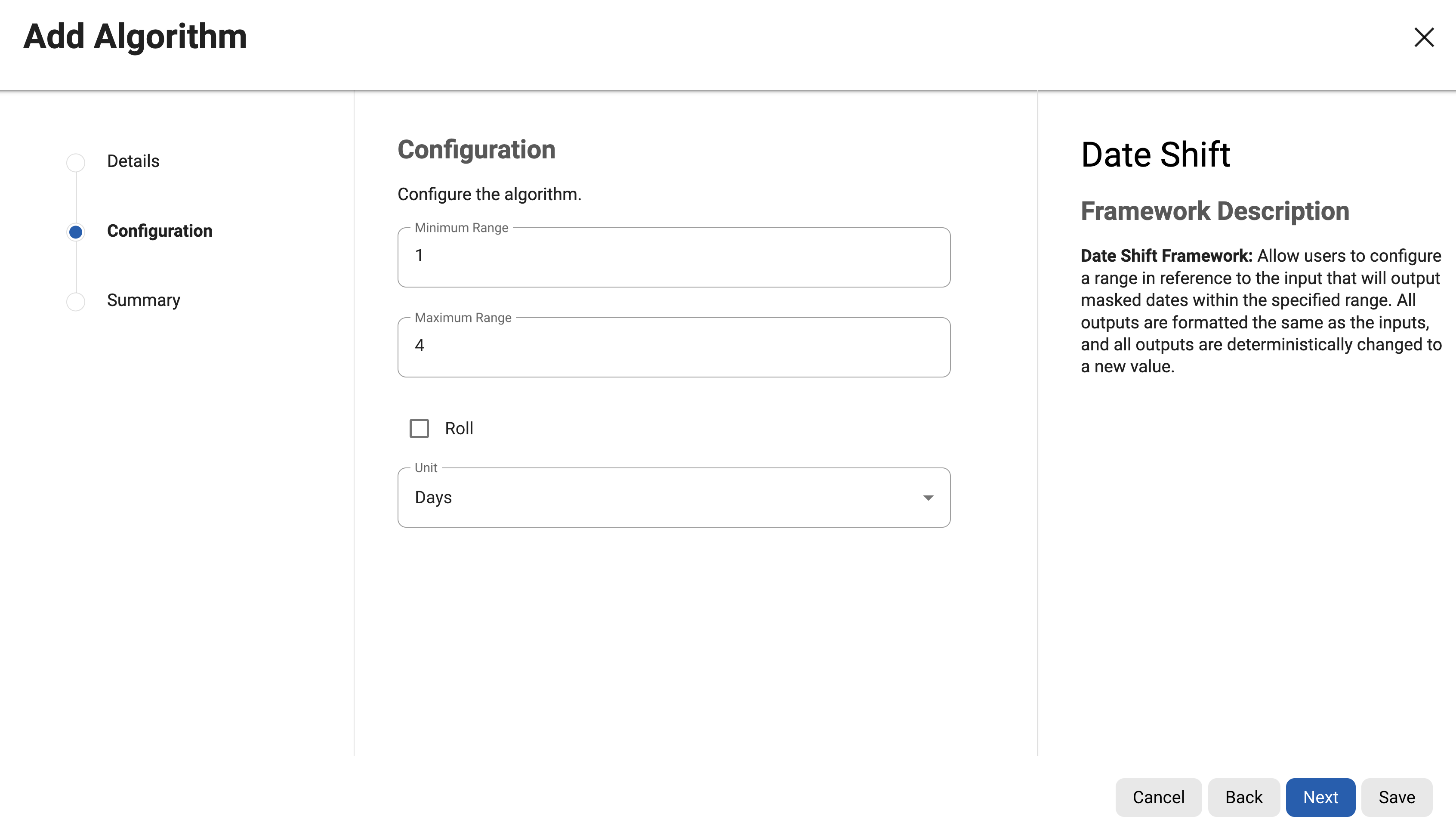 For more information for available Date Shift presets, refer to Out-of-the-Box Framework Algorithms page. For information on creating Date Shift algorithms through the API, see API Calls for Creating Algorithms - Date Shift.