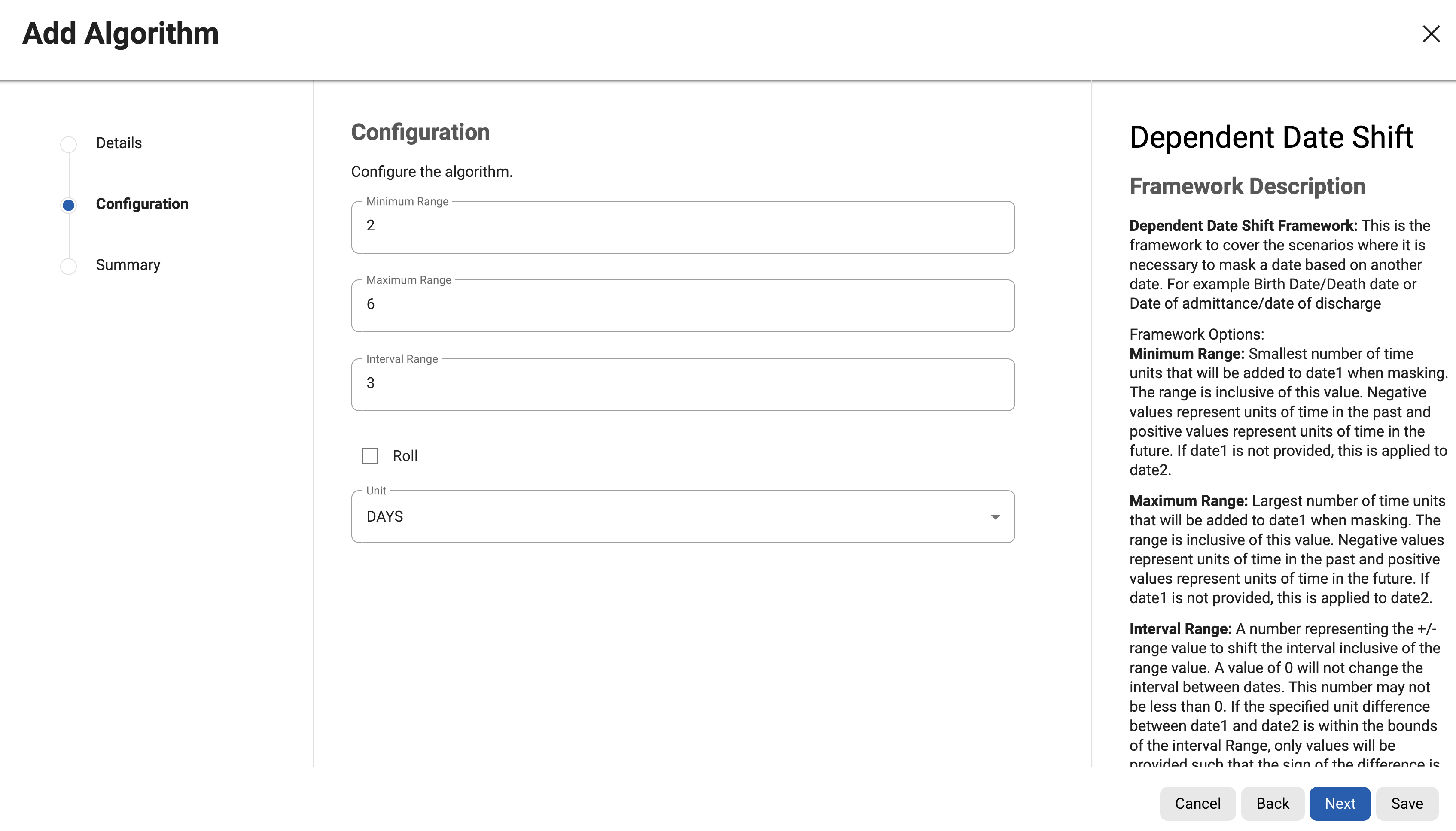 As an example, a Dependent Date Shift algorithm with a Minimum Range value of 3, a Maximum Range value of 5, and an Interval Range of 5 with the unit set to Days will shift the date1 input value by 3 to 5 days into the future. It will then change the interval by a range of +/-5 days from the original interval to mask date2. Dates may mask as follows: