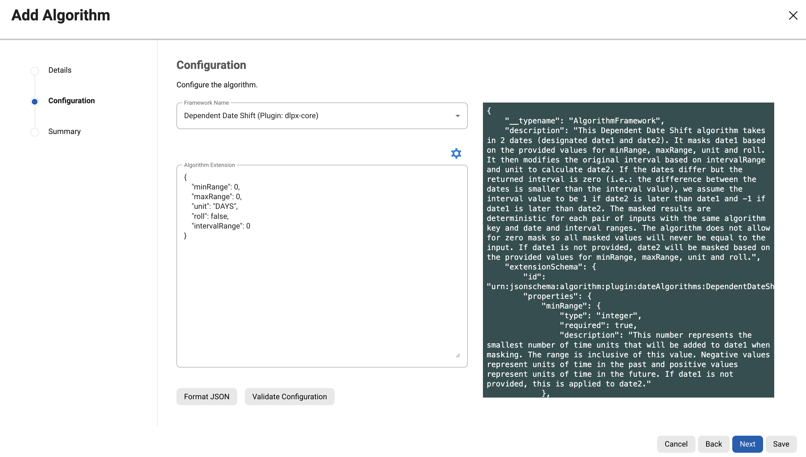 The Validate Configuration button will validate the Algorithm Extension format and validate against the selected framework configuration schema.