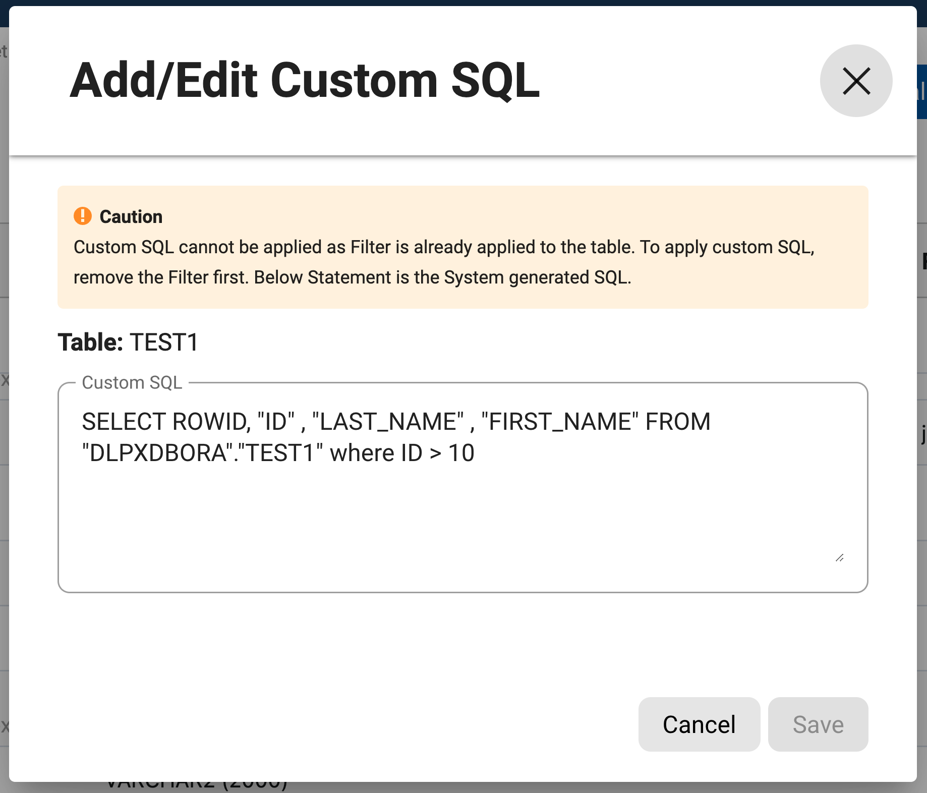 for updating Custom SQL under the Actions column on the row with the table name. It can show system-generated custom SQL.