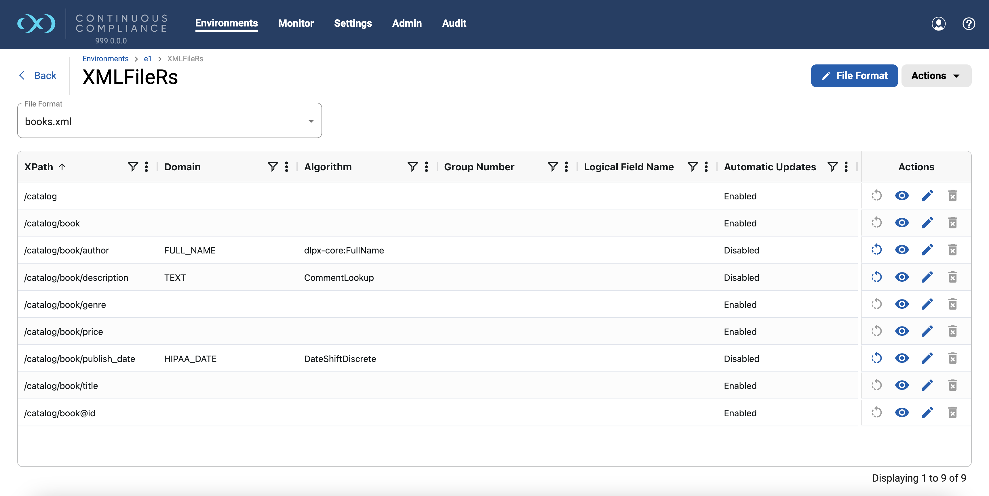 The image below shows the Inventory screen for the database rule set with a structured column. To quickly access an assigned File Format from this screen (books.xml in this example), click