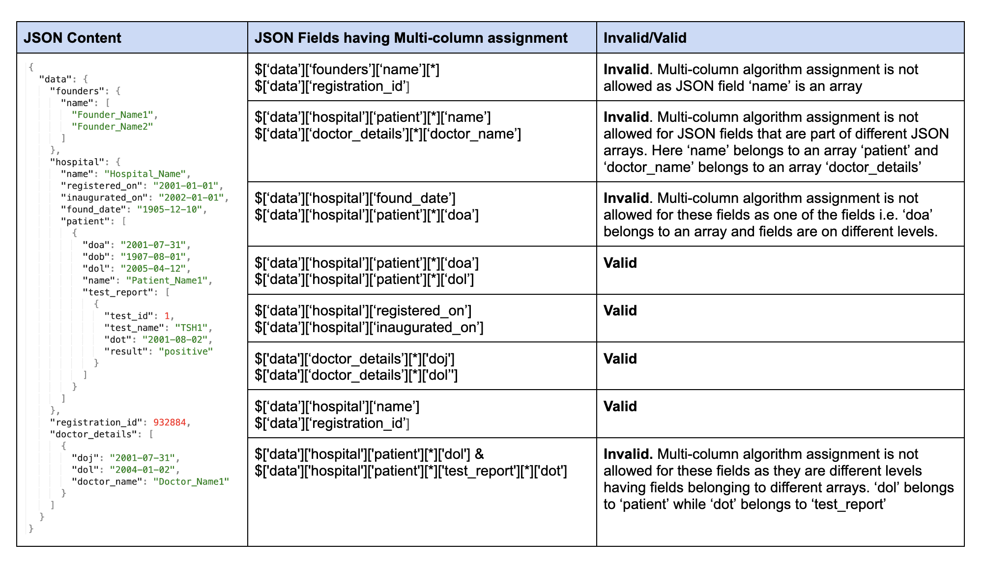 Below is a sample JSON file format with valid and invalid multi-column assignment examples.