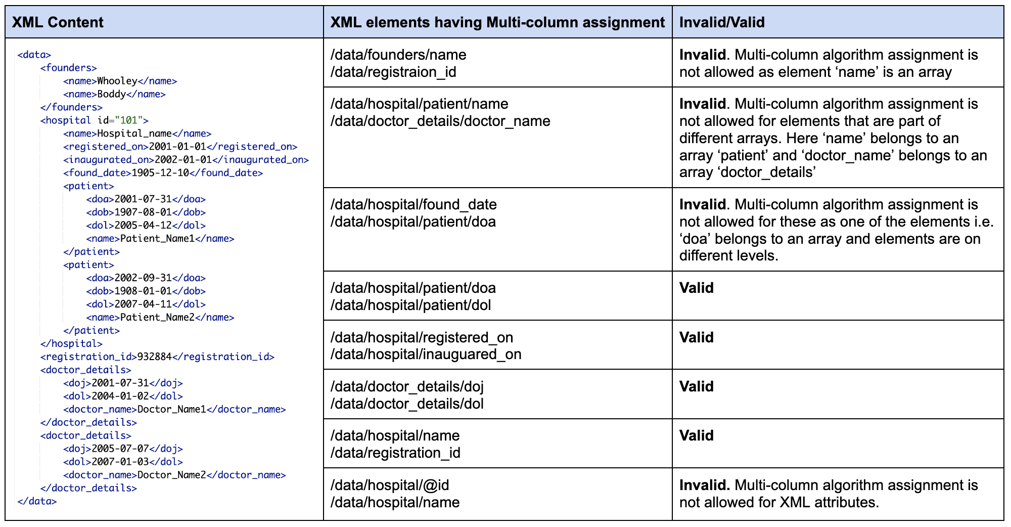 Below is a sample XML file format with valid and invalid multi-column assignment examples.
