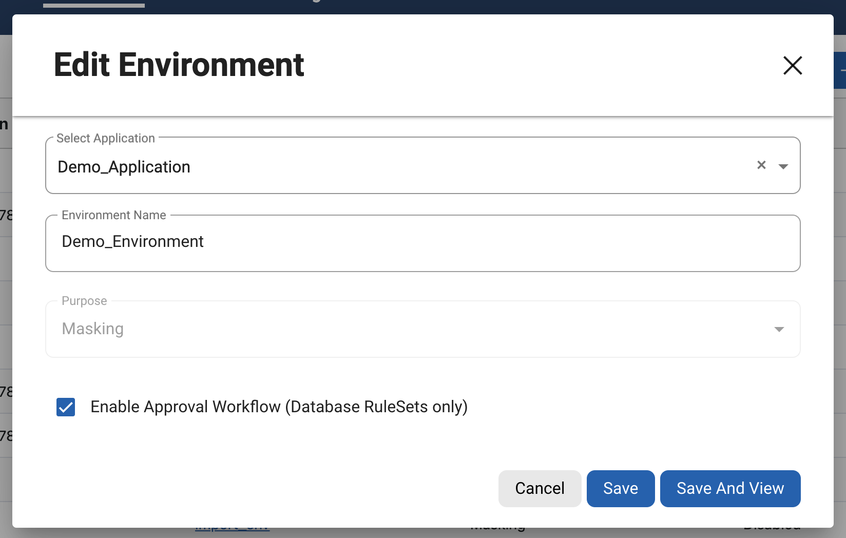 Users can enable the inventory approval workflow for any environment by selecting the checkbox “Enable Approval Workflow (database rule sets only)” at the bottom of the Add, Edit, or Copy environment dialogue boxes.