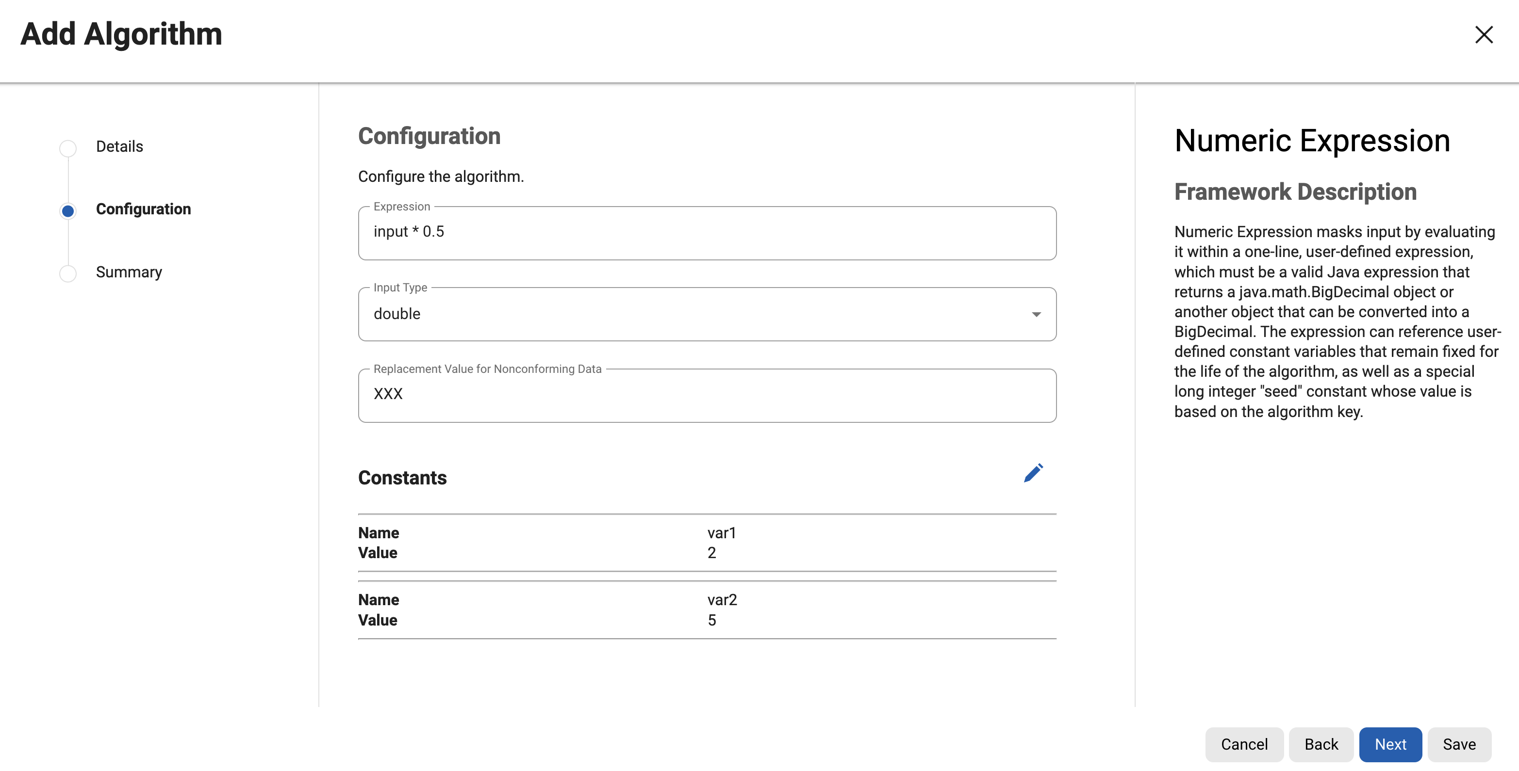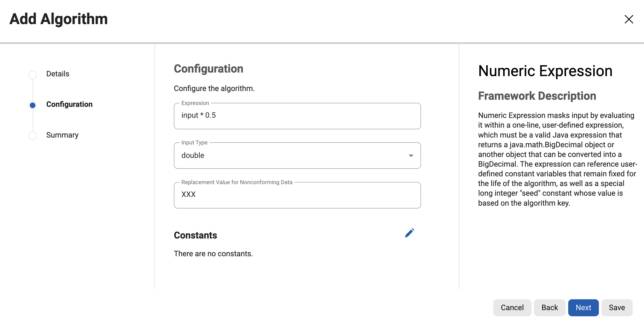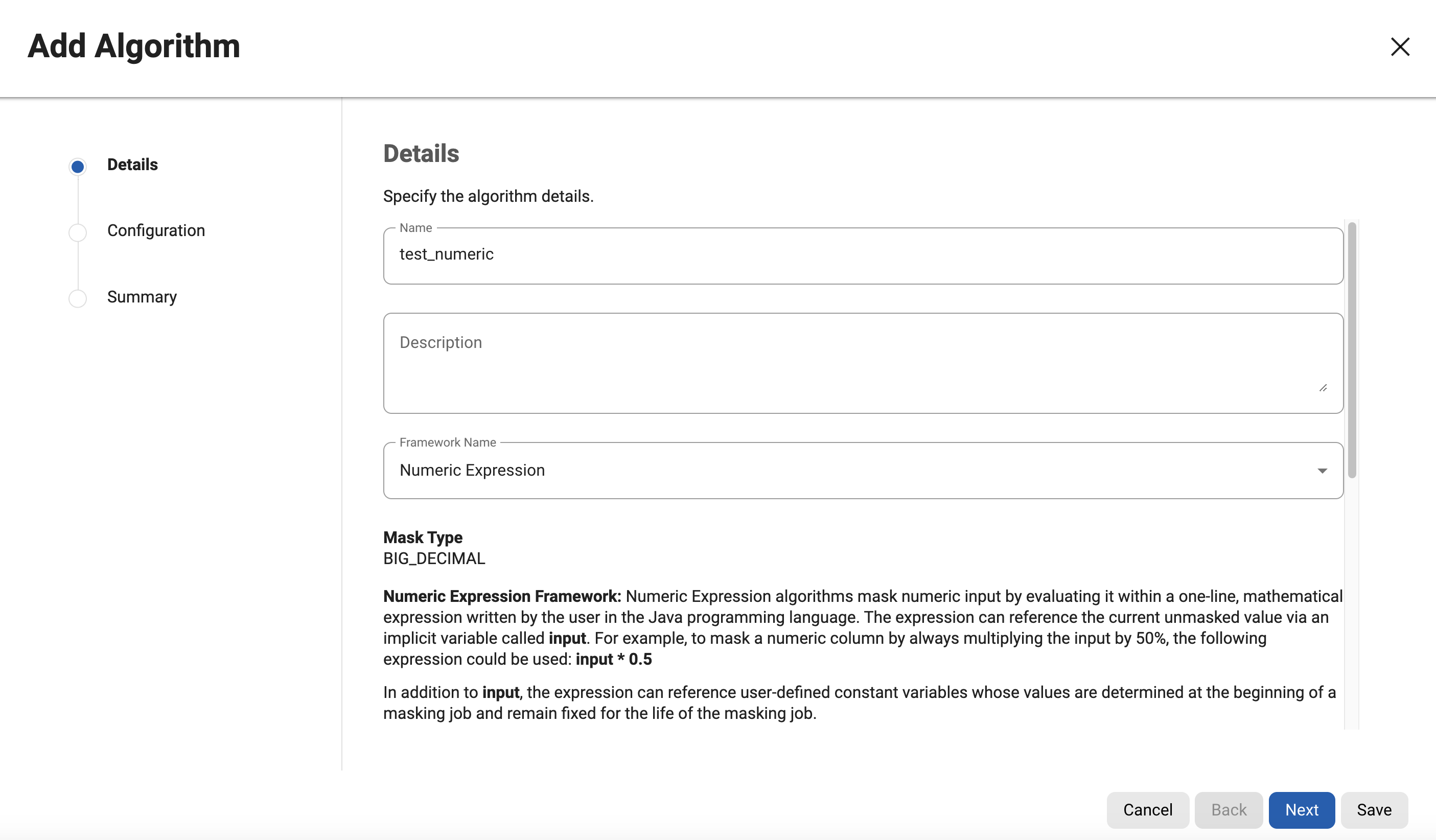 5. Enter an Expression. This must be a one-line, mathematical expression written in the Java programming language that references input (the current unmasked value), e.g. input * 0.5 or input + Math.random(). See below for more examples of expressions.