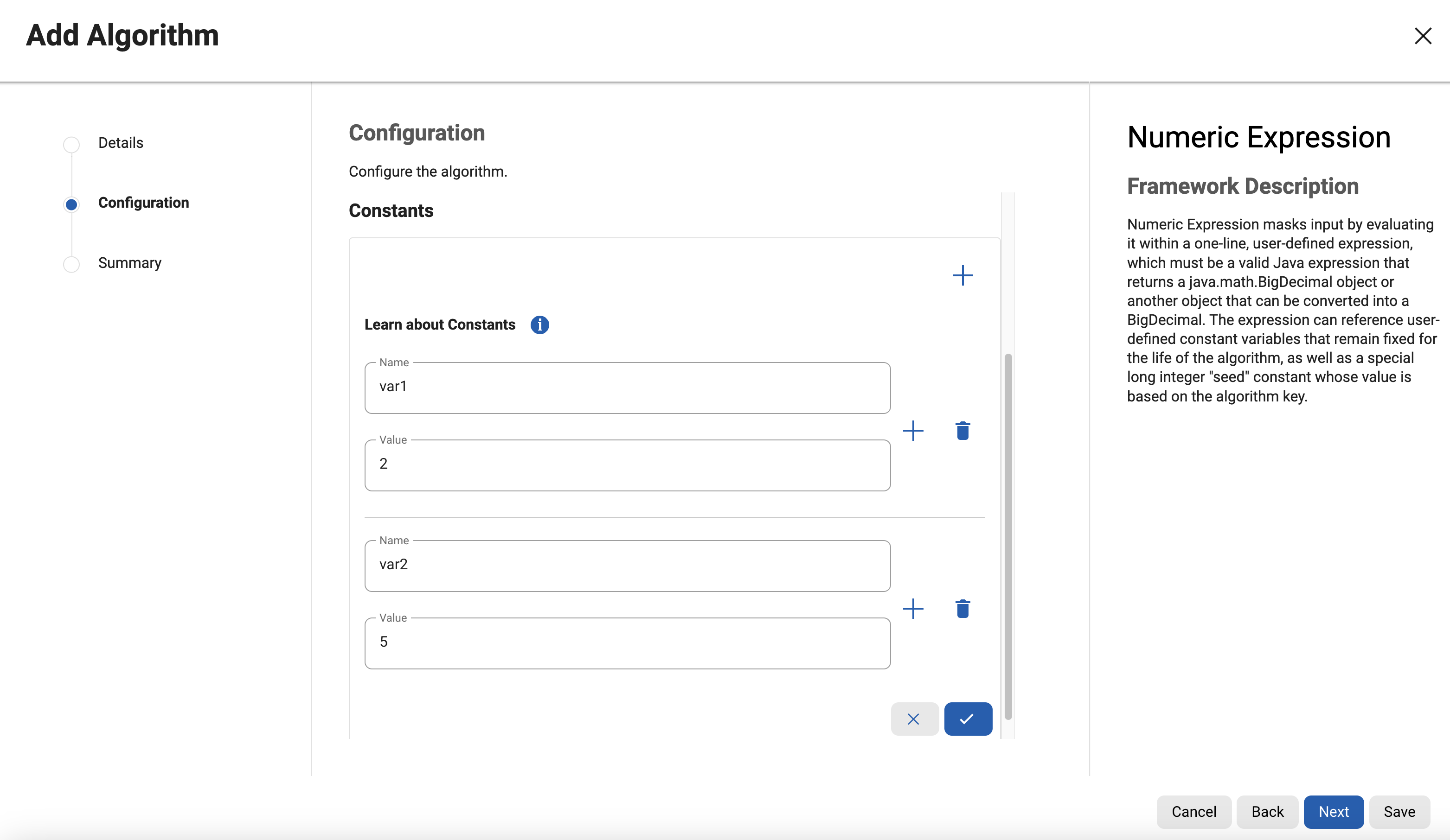Constant values are very much like the expression: one-line Java expressions that must return a value. However, unlike the algorithm's main expression, constant values aren't required to be numeric.