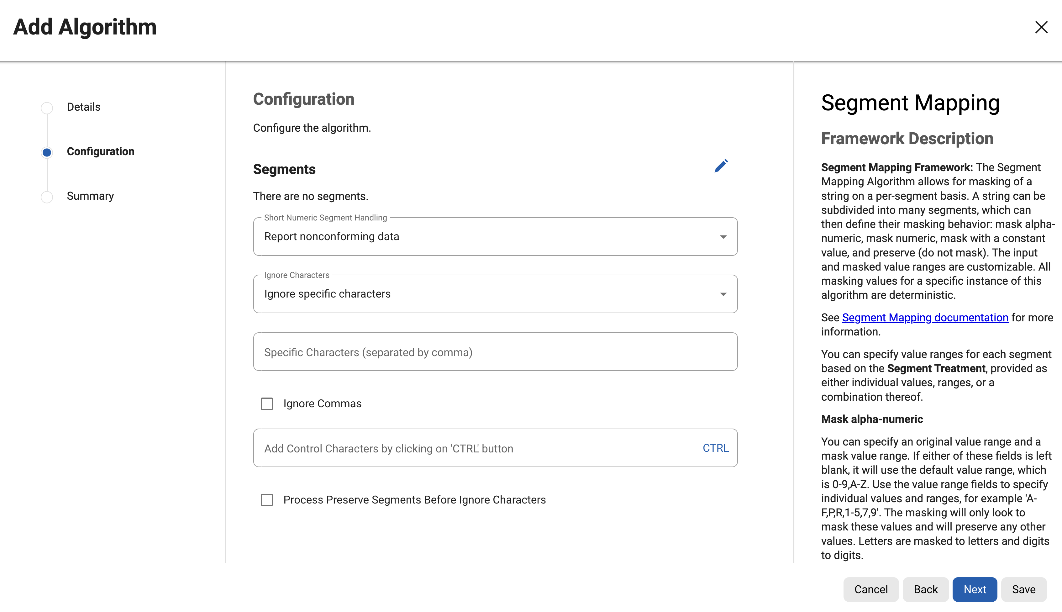 You might use this method if you need columns with unique values, such as Social Security Numbers, primary key columns, or foreign key columns. When using segment mapping algorithms for primary and foreign keys, in order to make sure they match, you must use the same Segment Mapping algorithm for each. You can set the algorithm to produce alphanumeric results (letters and numbers) or only numbers.