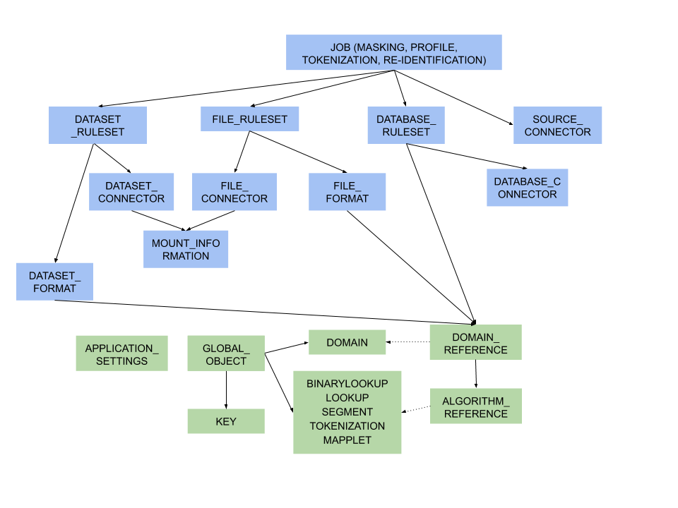 As mentioned in the Global Objects section, we expect the users to synchronize global objects and masking jobs at different frequencies. To avoid any unnecessary export of large algorithms, any objects (MASKING_JOB, PROFILE_JOB, DATABASE_RULESET, FILE_FORMAT and FILE_RULESET) that have dependencies on algorithms will export just the references to the objects by default. This way we check whether the necessary dependency exists on the importing engine by comparing the references; if not, we fail the import execution with an appropriate message. Domains, profile sets, and classifiers are the exception to this. Exporting any of these objects will also export the full algorithm.