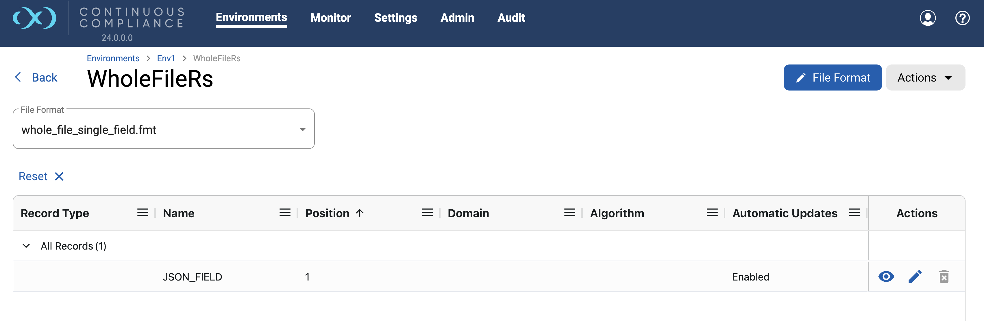 Go to Environments > Rule Set and click on the hyperlink of the ruleset name associated with the above ruleset. Alternatively, you can navigate to Settings > Data Format and click on the hyperlink of the name of the single-field file format created above. This will bring up an inventory-like screen listing an entry for the single-file field.