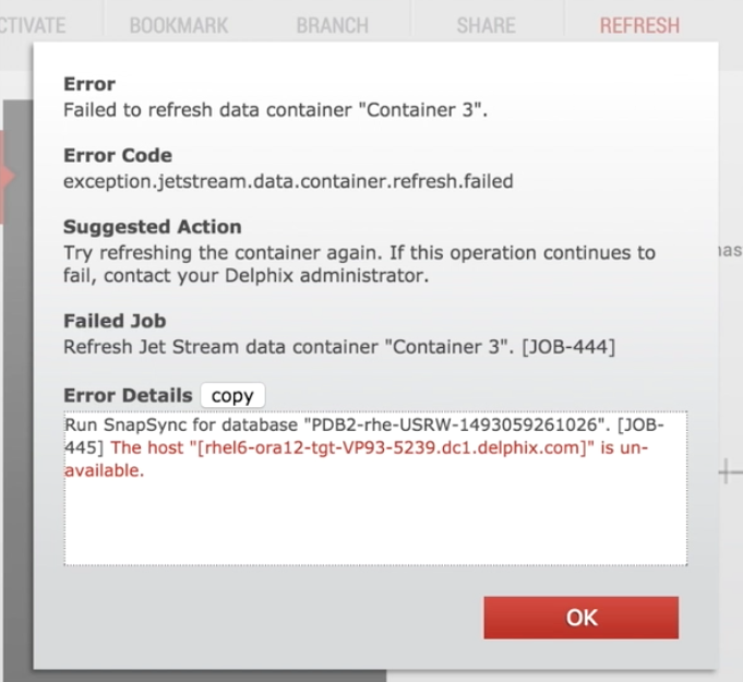 The copy button enables you to copy and paste error details, which you can then send to your Delphix administrator for further assistance.