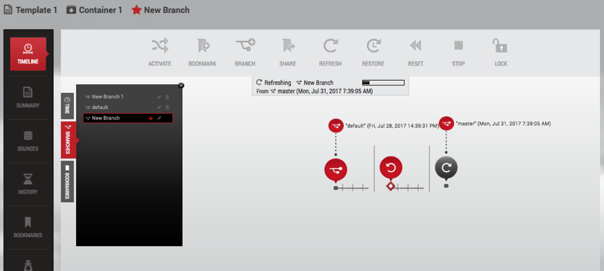 Refresh creates a new timeline segment on the active branch. This refreshes each source in the data container to the latest data in the corresponding source of the data template.