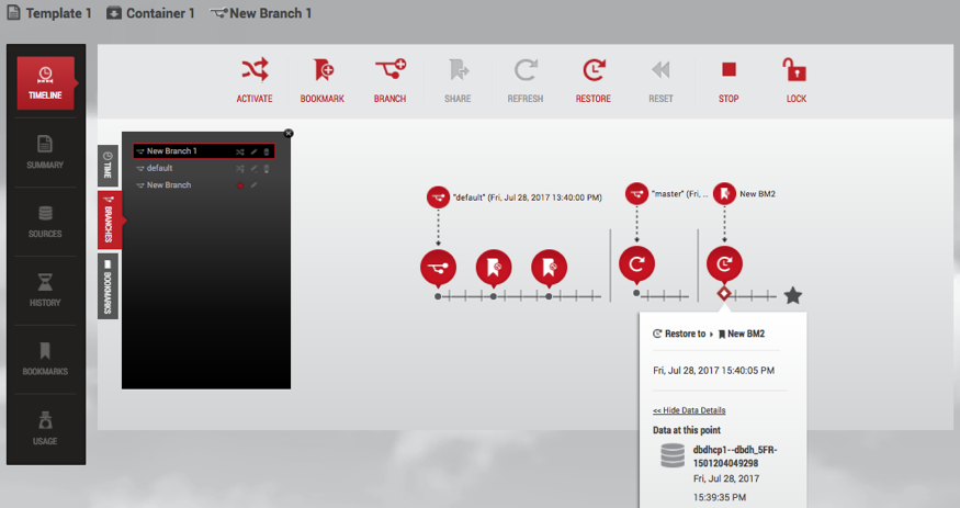 If you restore data back to a point in time on the data template master timeline, you will be asked which data container to restore into. It will then: