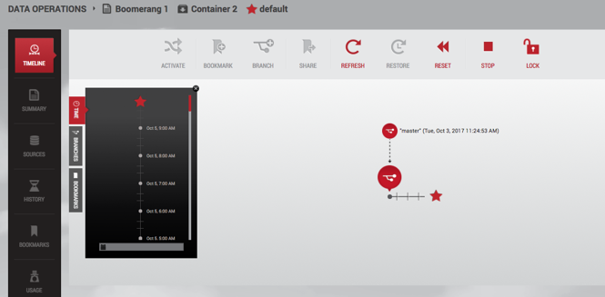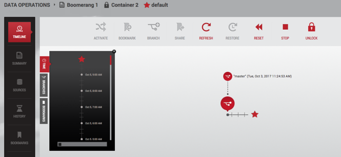 Within a single data container, only one branch is active at any given time. The data located at the red star of the active branch's timeline is the newest copy of the data from the data container's data sources.