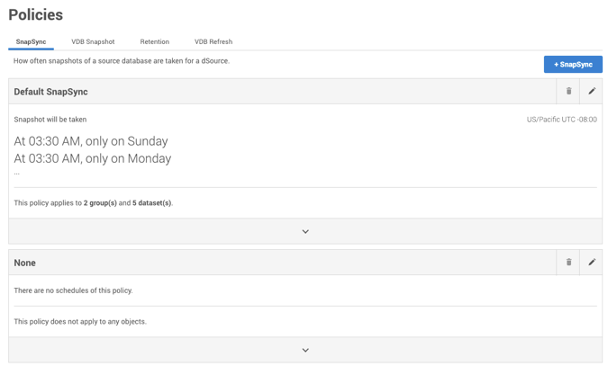 SnapSync policies provide you the ability to specify how frequently the Delphix Engine takes a copy-only full backup of a source database when Delphix Managed Backups are enabled. Selecting an initial SnapSync policy is mandatory at dSource link time. However, you can change the SnapSync policy that the Delphix Engine applies to a dSource at any time by visiting the policy management screen: