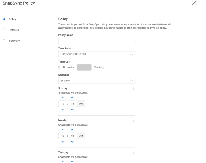 For dSources that have Delphix-managed backups enabled, the current SnapSync policy will be displayed under the SnapSync column. The rows corresponding to dSources that do not use Delphix Managed Backups will be grayed out. Clicking the current SnapSync policy for a dSource will display a drop-down menu of existing SnapSync policies along with the option to create a new SnapSync policy. Selecting a SnapSync policy from this list will change the current SnapSync policy for the dSource. When creating a new policy, you will see the following screen:
