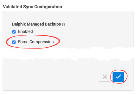 When the Force Compression checkbox for Delphix Managed Backups is selected and the backups are not compressed, the Delphix Engine will take a compressed copy-only full backup of the source database and this will take effect during the next scheduled Snapshot or SnapSync operation.
