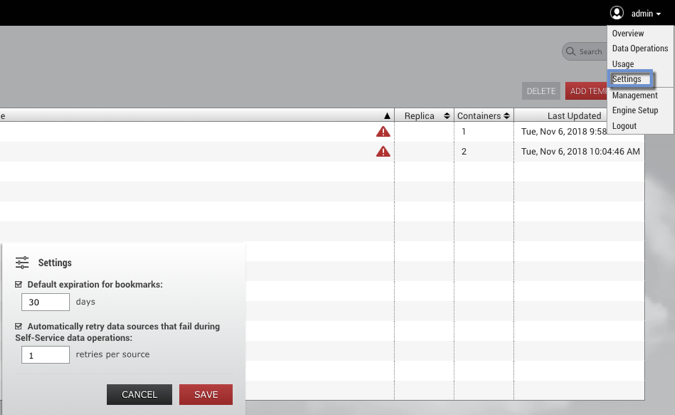 You can open the Administrator Settings dialog from the user drop-down menu. Here you can edit various settings that apply globally to all Delphix Self-Service users.