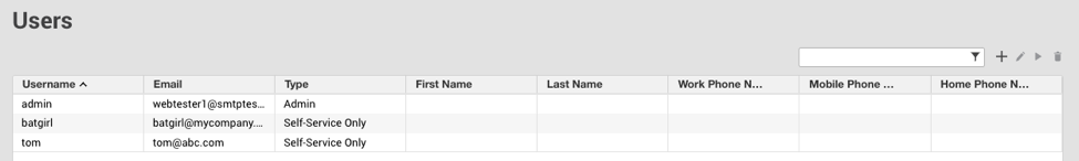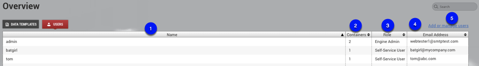 List of all configured users. You can click on a user to see their details, such as what containers they are assigned to.