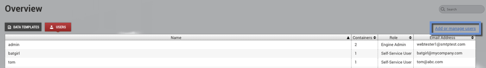 To add or manage user roles and permissions, select the Add or manage users link from the Users Overview screen.