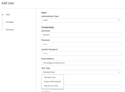 Selecting the + icon opens the Add User window. Use this window to add a user and select the user role and permissions.