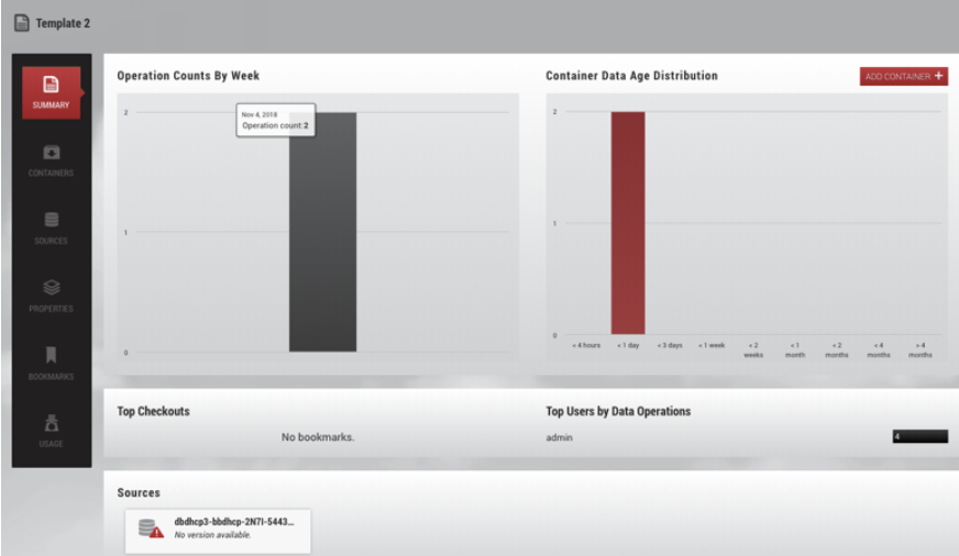The Data Template Management page contains a view panel of 6 tiles on the left-hand side of the screen. Each tile reports on a variety of useful information, such as user activity, data sources, data capacity, specific details about data containers, and data templates. They also help you navigate to areas where you can complete specific tasks, such as creating a new template or container, working with data timeflows, assigning users to containers, and bookmarking important points in time.