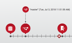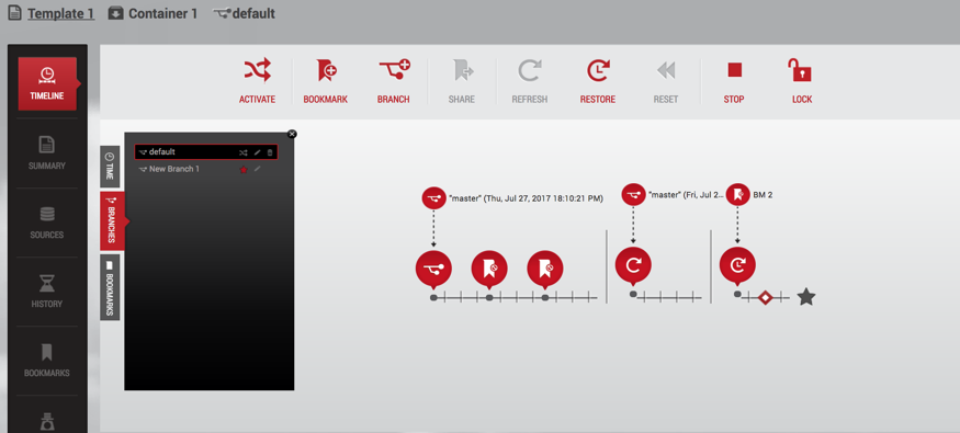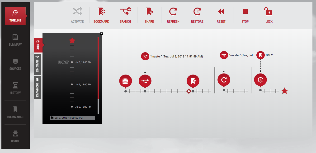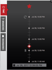 Clicking a point in time in the container timeline will display the corresponding branch timeline capturing any actions performed on the branch. Additionally, should you need to select a time between tick-marks, you can use the time input field in the time selector on the left side of the screen.