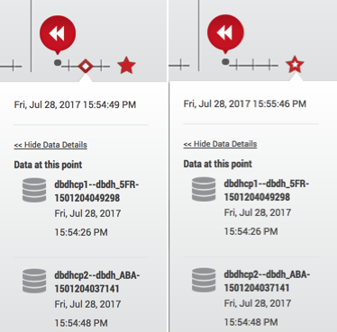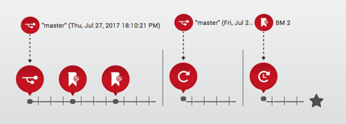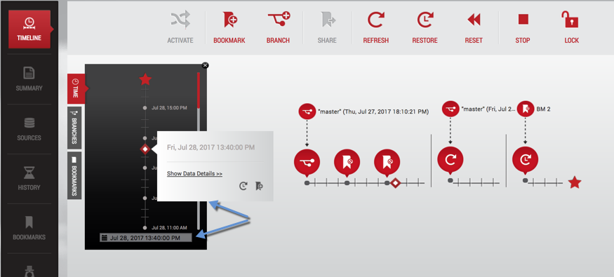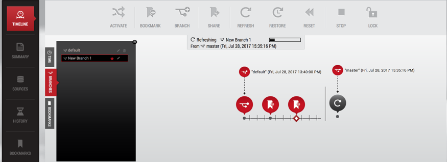 As mentioned above, the branch timeline becomes segmented after you have performed a specific action or task, such as Refresh. Based on the action, two red bubbles will appear in the time segment. The top bubble indicates where the data used for this action came from – for example, the data template, a different branch, or a shared bookmark. The second red bubble appears on the timeline as the actual data stream in a point in time from the parent data. It appears because of actions such as Refresh, Reset, Restore, Create Branch and Bookmark. Clicking the second bubble will show you specific details of the action, such as the specifics of the action including its name, the time the action occurred, and the data sources used at a point in time. This is illustrated below.