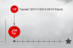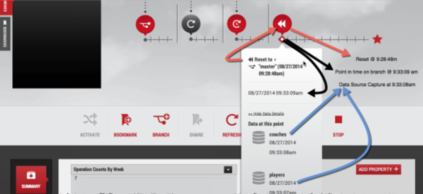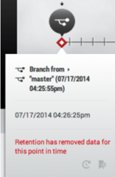 The following illustration shows that on 8/27/14, at 9:33:09am, data was reset to the parent data branch (master) at 9:28:48am, capturing data points from 9:33:06am.