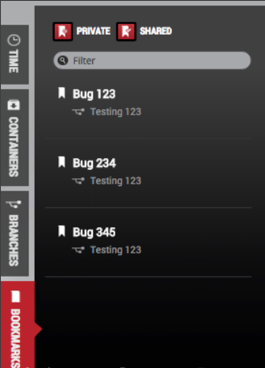 The Bookmarks tile in the Data Container Report Panel allows you to see all bookmarks within your container and all bookmarks that other users have made available to you. Here you can also edit details about bookmarks, create new branches, and restore the active branch to the bookmark's point of data time.