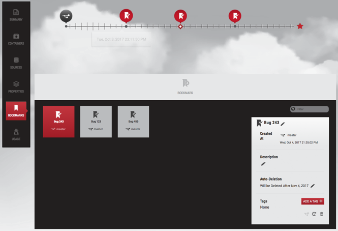 Bookmarks are a way to mark and name a particular moment of data on a timeline that makes it easy to search and find events later. Once a point in time is selected, you can create a bookmark. You can select a specific point in time on the branch timeline, the Delphix Engine will then map that point to the closest usable point in time for each data source. Based on the properties of the underlying data sources, time may not be the same for every data source in the container. Not all data sources track changes at the same granularity. For more information, see Working with Bookmarks in a Data Container.