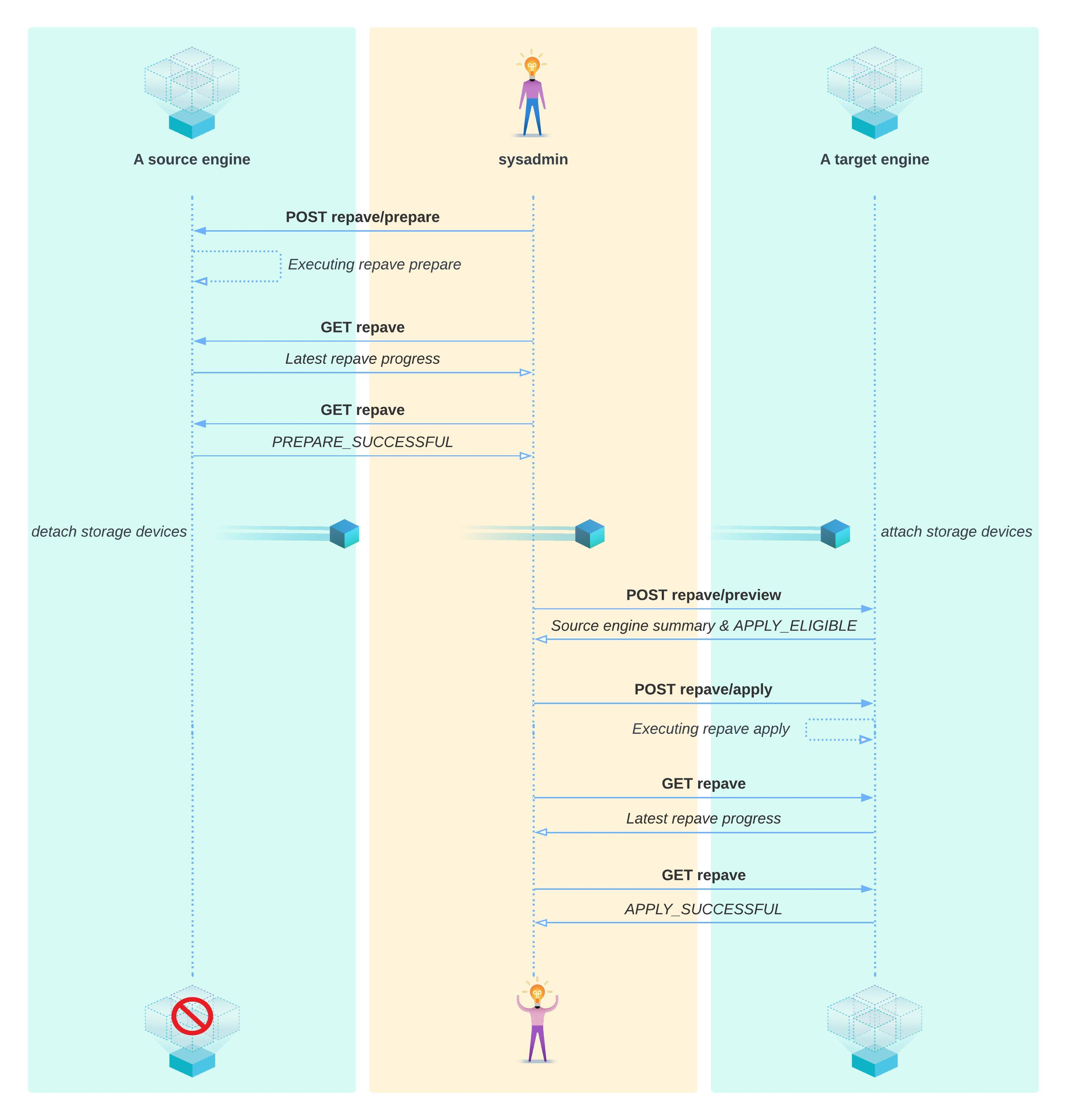 Delphix sysadmin calls repave/apply on the new engine. The Delphix management service will be restarted and all previously disabled data sources will be enabled again.