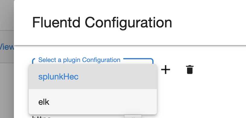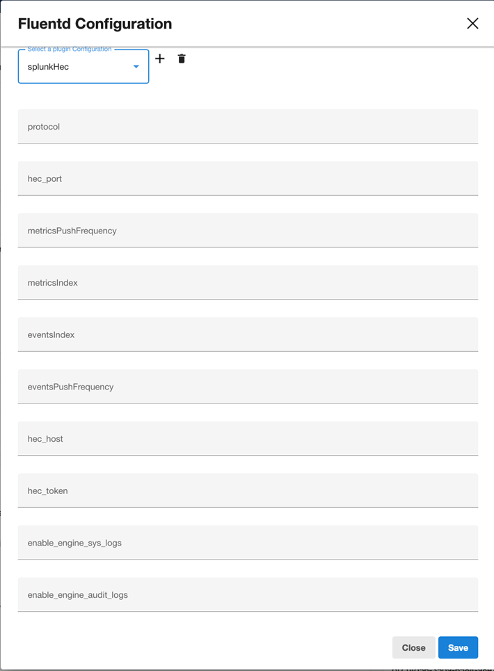 The Fluentd plugin is a tar file with a configuration template, including any gem files required to execute the directives in the configuration file. When you upload the plugin, the configuration occurs by collecting user input for the variables required by the template. The interfaces change because the set of variables you need is now mutable from plugin to plugin. Splunk configuration is available out of the box with no additional plugins. This feature uses one UI for all Fluentd configurations.
