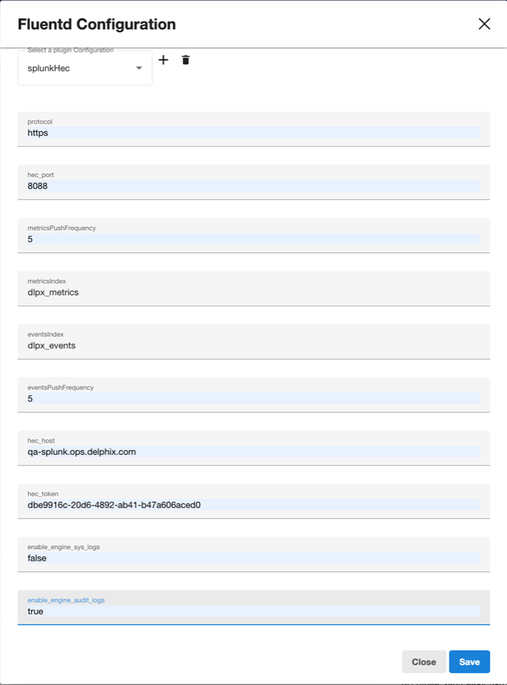 service fluentd configuration create attributes *> add; set name=hec_host; set value=http://vmname-splunkhost.delphix.com; back