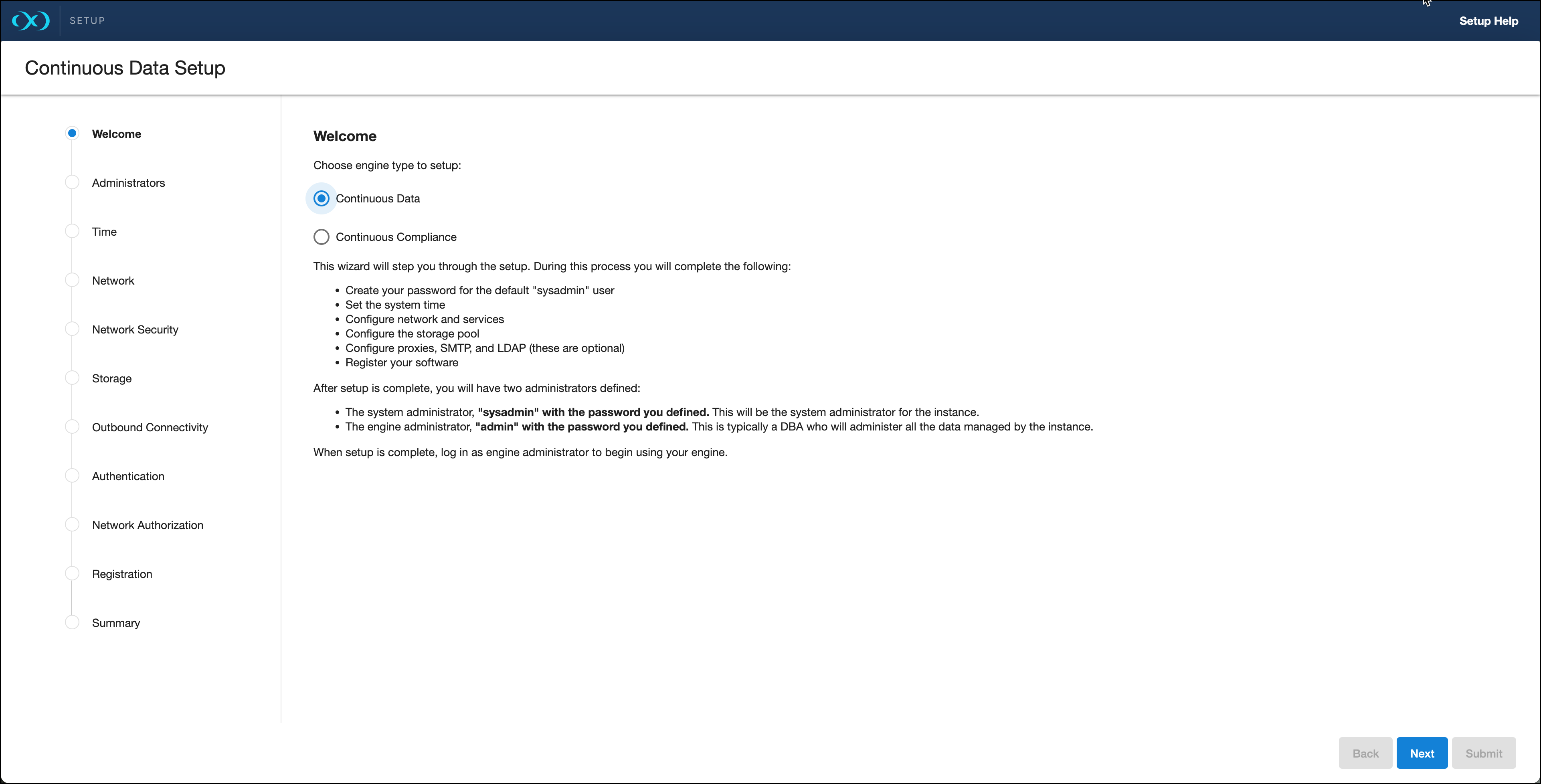 The Welcome section asks users to select the engine type being setup, whether Continuous Data or Continuous Compliance. This article explains the Continuous Data setup, the Continuous Compliance version can be found at First time setup.