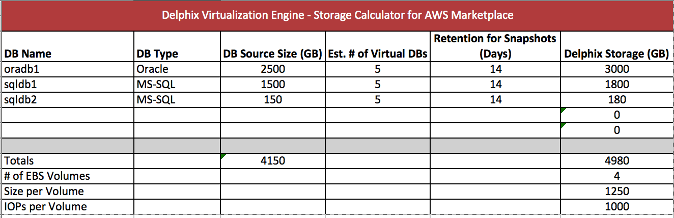 In the above example, there are three (3) source databases listed with their current sizes. Each is estimated to have 5 virtual copies as well as a 14-day retention period for snapshots/backups. The calculator indicates to add four (4) EBS-provisioned IOPS volumes, each being 1250GB with 1000 IOPS.