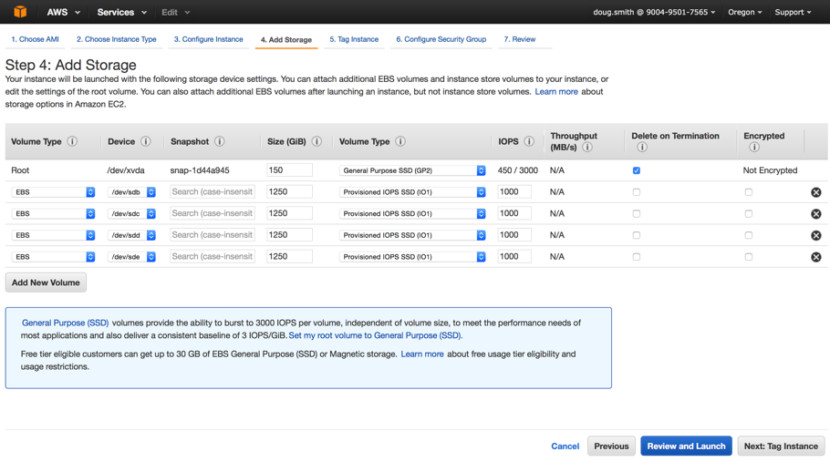 Follow the above procedure for adding as many EBS volumes as specified in the calculator. Based on the example above, the storage configuration would look as follows: